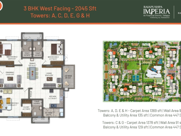 Spacious 3BHK apartment available for sale in the Rajapushpa Imperia, Tellapur. This West facing flat is 2045 sq. ft. with courtyard view. Located on the 7th floor of a 40-floor tower, the apartment enjoys excellent ventilation, natural light and panoramic surroundings.